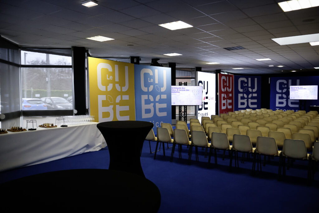 - – En fond de salle, des mange-debout ont été disposés pour la partie cocktail, autour d’une galette à partager, favorisant les échanges dans une ambiance conviviale. Les chaises ont été retirées par l’équipe technique du Cube afin de proposer un espace plus spacieux.